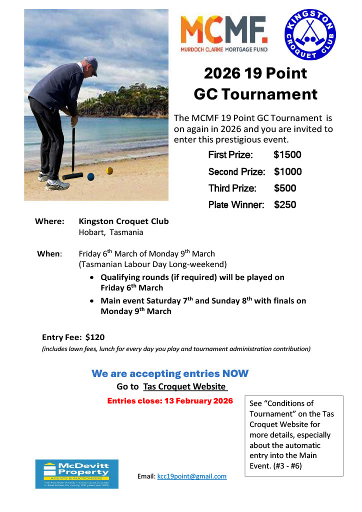 | MCMF GC 19 Hoop Event | Fri 06th Mar to Mon 09th Mar 2026 | 6:00 pm Fri 13th February 2026 | Golf Croquet | South | |